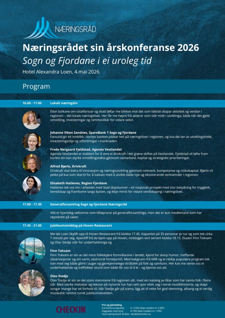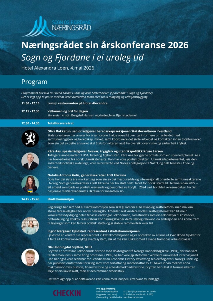 I tillegg møter du Olivia Bakektun frå Statsforvalteren Vestland, Ingrid Nergaard Fjeldstad frå Skattekommisjonen, Ola Grytten frå NHH og representantar for det lokale næringsivet.